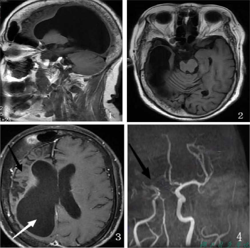| 磁共振平扫+增强 | 右侧大脑半球皮层及皮层下脑实质体积缩小,右侧残余脑白质T2t1a1信号增高,右侧大脑半球脑沟、裂增宽,右侧脑室明显较对侧扩大,中线结构稍向右侧偏移。右侧额颞顶枕骨板障明显增厚。右侧额窦较对侧明显扩大,其内气化良好。左侧放射冠区见多发斑点状异常信号,T2WI及T2f1a1r是高信号,左枕叶(侧脑室后角下)见一囊状T2WI高信号影,直径约0.9cm。颅内未见明显流空信号团注G-DTPA增强扫描:颅内未见明显导常强化灶。 | 1.戴克-戴维多夫-马森(Dyke-Davidoff-Masson)综合征可能性大。 2.左侧放射冠区多发腔梗。 3.左侧枕叶囊肿。 |