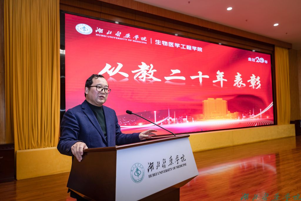 从教二十年教师表彰环节,涂汉军讲述了医学检验系走过的这二十载光阴。他表示检验专业从最初的艰难起步到如今的成绩斐然,离不开每一位师生的努力与奉献,站在医学检验发展的新起点,医学检验与人工智能的融合势在必行,医工结合更是关键路径。持续推进学科交叉创新,为医学检验领域注入新活力,推动教育质量与行业发展迈向新高度。